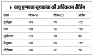 कुंजेमुरा में शाम पांच बजे से अगले दिन सुबह 5 बजे के बीच पीएम-10 की मात्रा अधिकतम 179 माइक्रोग्राम प्रति घन मीटर से पाई गई है। सोमवार-मंगलवार दरमियानी रात एक बजे यह 139 रहा जबकि मंगलवार रात 8 बजे 179 हो गया। मिलुपारा में शाम करीब पांच बजे ही पीएम-10 का स्तर 198 पहुंच गया। रात भर यह 100 के पार ही रहा। पीएम-2.5 का मानक स्तर 24 घंटे के लिए 60 माना जाता है। चारों जगहों पर दोनों ही प्रदूषकों का स्तर मानक से अधिक है।